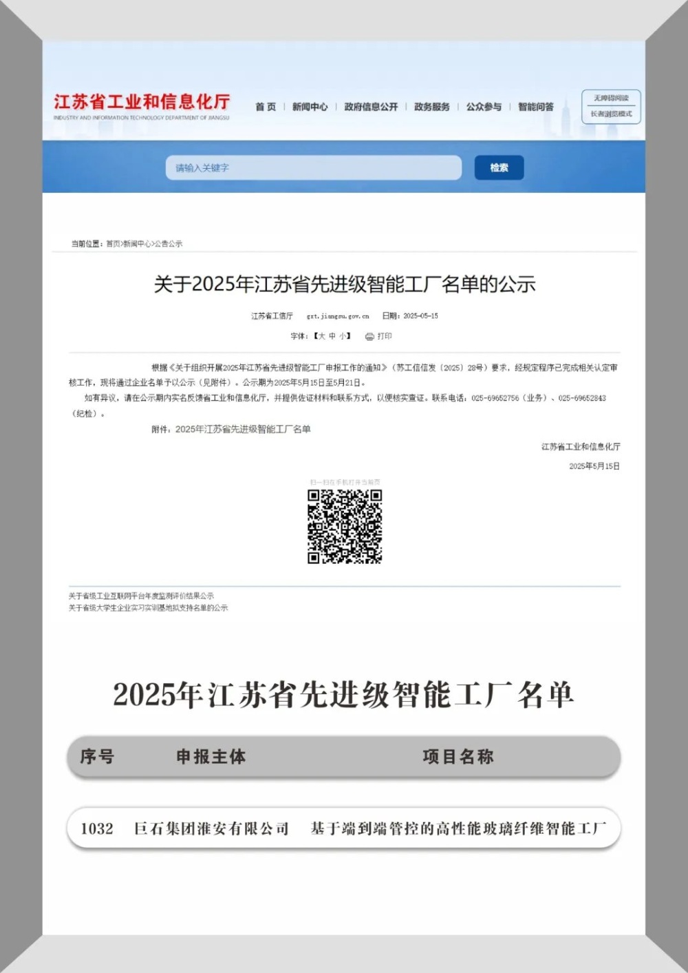 由江蘇省工業(yè)和信息化廳發(fā)布的“2025年江蘇省先進級智能工廠名單”公示的名單中,巨石淮安公司憑借“基于端到端管控的高性能玻璃纖維智能工廠”成功入選江蘇省先進級智能工廠。