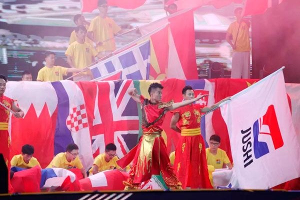 巨石產(chǎn)品遠銷全球,巨石旗和數(shù)十面國旗在舞臺上縱情揮舞,五彩飄揚的旗幟展現(xiàn)出巨石人勇敢走出去、堅定走下去、健康走回來的自信與豪邁。