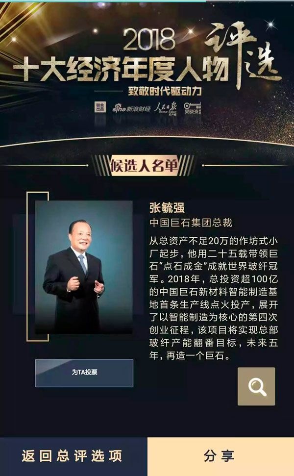 中國巨石總裁、巨石集團董事長兼CEO張毓強,與馬云、馬化騰、任正非、俞敏洪、李書福等知名經(jīng)濟人物一同入圍最終的140名網(wǎng)絡(luò)票選名單,名單還包括中國建材集團董事長宋志平、烏鎮(zhèn)景區(qū)/古北水鎮(zhèn)打造者陳向宏等。