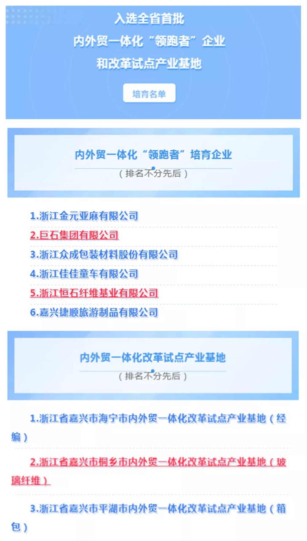 為推進內(nèi)外貿(mào)一體化發(fā)展,加快建設(shè)國內(nèi)國際雙循環(huán)戰(zhàn)略支點和樞紐,浙江省商務(wù)廳發(fā)布了《浙江省商務(wù)廳關(guān)于培育內(nèi)外貿(mào)一體化“領(lǐng)跑者”企業(yè)、內(nèi)外貿(mào)一體化改革試點產(chǎn)業(yè)基地和征集內(nèi)外貿(mào)一體化典型案例工作的通知》,巨石集團榜上有名,浙江省桐鄉(xiāng)市內(nèi)外貿(mào)一體化改革試點產(chǎn)業(yè)基地(玻璃纖維產(chǎn)業(yè)基地)為內(nèi)外貿(mào)一體化改革試點產(chǎn)業(yè)基地。