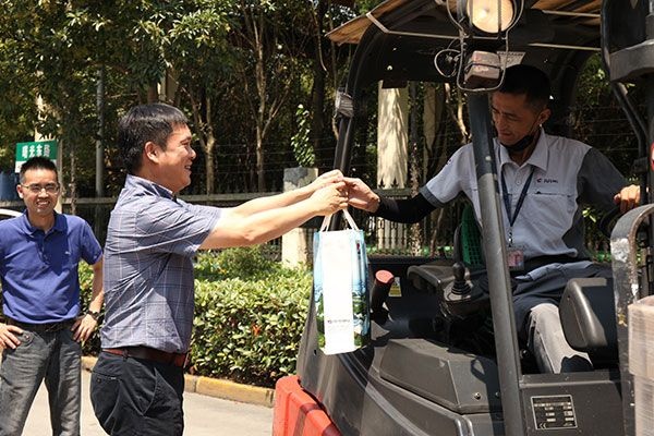 在二、三分廠的發(fā)貨平臺(tái)上,叉車司機(jī)們正頂著烈日作業(yè),楊國明和曹國榮帶著滿滿的心意走上前與他們握手,為他們送去清涼慰問品,并對(duì)叉車司機(jī)們連聲說著“你們辛苦了。”
