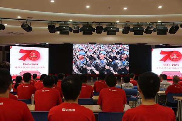 10月1日,中國巨石舉行慶祝新中國成立70周年升旗觀禮活動,中國巨石副總裁、巨石集團總裁楊國明及各單位團員青年代表100人參加活動。
