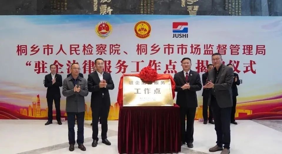 11月17日,桐鄉(xiāng)市人民檢察院、桐鄉(xiāng)市市場監(jiān)督管理局“駐企法律服務(wù)工作點(diǎn)” 揭牌儀式在中國巨石大樓舉行。中國巨石副總裁、巨石集團(tuán)總裁楊國明,桐鄉(xiāng)市人民檢察院檢察長陳國根,桐鄉(xiāng)市市場監(jiān)督管理局局長楊雪乾,桐鄉(xiāng)市工商聯(lián)黨委書記、副主席費(fèi)建良共同為“駐企法律服務(wù)工作點(diǎn)”揭牌。