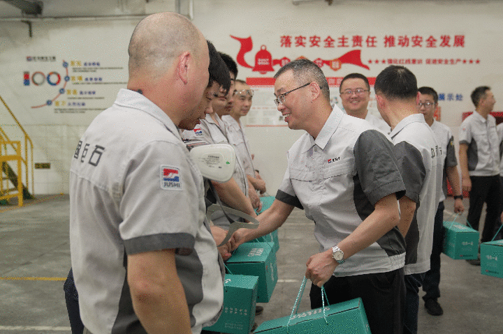 楊國明總裁一行首先來到了公輔保障中心燃?xì)庹?。時(shí)值正午,火辣的太陽炙烤著地面,涌起陣陣熱浪。由于燃?xì)庹咀鳂I(yè)的特殊性,要求露天作業(yè),特別是在高溫天氣下,員工們更需要打起十二分的精神。楊國明總裁微笑著和堅(jiān)守工人們握手,并將清涼慰問品交到他們手中,表示感謝。