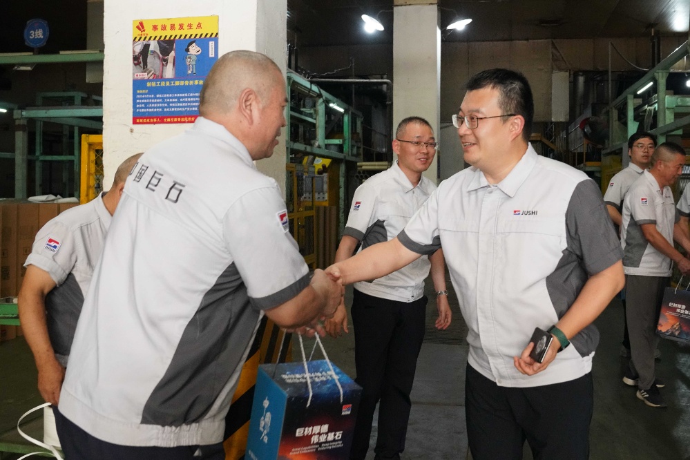 7月16日,中國巨石黨委書記、總裁楊國明帶隊(duì)慰問高溫崗位員工,為他們送“清涼”。