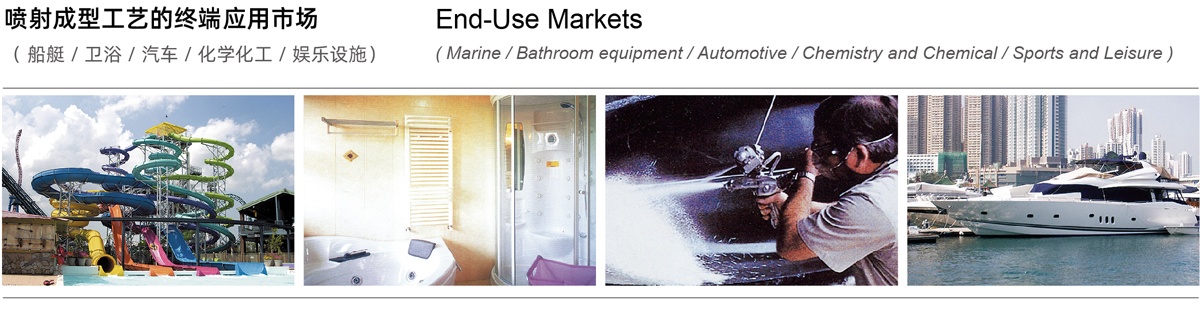 | 180 | 噴射操作順暢性好,浸透速度適中,易輥壓,易排泡, 小角度無回彈,制品力學性能和耐水性能優(yōu)異, 適合高速的機械手噴射工藝 Good runnability for spraying operation, moderate wet-out speed, easy roll-out, easy removal of bubbles,no spring back in sharp angles, excellent mechanical properties and hydrolytic resistance in parts, suitable for high-speed spray-up process with robots | 衛(wèi)浴、玻璃鋼船體、 汽車配件、化學貯罐 Sanitary ware, FRP hulls, auto parts, chemical storage tanks | |