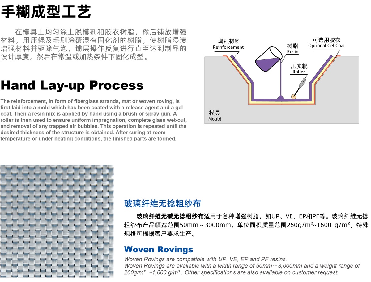 | P02 | 拉伸強度高,適用于手糊工藝生產面積較大的制品,樹脂浸穿性好, 浸透速度快,氣泡氣容易排除,制品機械強度高,優(yōu)異的耐酸腐蝕性能 High tensile strength, suitable for use in hand lay-up process to produce large-area parts, good wet-through and fast wet-out in resins, rapid air lease, high mechanical strength | |